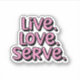 A fun typography design with the words "Live. Love. Serve." in a retro font. The perfect gift for pickleball players.