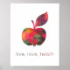 Decorate your classroom with this fun and colourful poster. Apples are commonly associated with teachers, but this design adds a fun twist to that idea. The apple features a colourful geometric pattern. Some of the colours inside the pattern are: pink, green, purple, yellow, and many more. The words read "Live Love Teach" in a clean, sans-serif font. This is a popular phrase among teachers who enjoy what they do for a living. This poster is available on many types of paper and in several sizes to suit your needs. Not a teacher? No problem! This poster would make a great gift for your child's teacher, or for your friends who are teachers! Teacher appreciation week always occurs during the month of May, and it’s a great time to show a teacher how much you appreciate their hard work! What better way to do that than by giving them this great product?