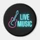Fun kitchen magnet for musicians and music lovers features "Live Music" aqua neon text with a pink and aqua guitar outline.