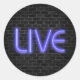 Illuminated urban brick wall with LIVE text in glowing purple neon lights.