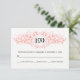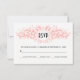 Living coral and white floral heraldic crest wedding RSVP response card. It showcases a heralded crest with flowers. The back includes a coral and white polka dot pattern.