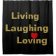 Inspirational “Living, Laughing and Loving” black and gold shower curtain. The black background colour can be changed by the customer.
