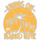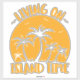 Vector illustration of a tropical sunset and palm trees on a small vacation island paradise with Living On Island Time text. Keywords: beach, caribbean, cartoon, illustration, island, isle, palm, palmtree, paradise, sea, season, silhouette, summer, sun, sunrise, sunset, tree, tropic, tropical, vacation, vector, palms, time