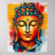 A vibrant painting depicts the serene face of Buddha, rendered in bold strokes of colour. His closed eyes are conveying a sense of tranquillity and inner peace. The background features a dynamic interplay of yellow, red, blue, and black hues, creating a sense of energy and movement.