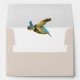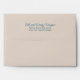 Sand tan A7 size envelope with sea theme design. Seashells and coral decorate the lower left corner on the front. A sea turtle image is under the flap. Names and return address can be added to the flap in script and printed fonts in blue.
