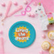 Living the dream fun food plates for party. Cute design with inspirational quote. Vintage typography with red hot sun logo. Unique paper plates for BBQ, celebration and more.