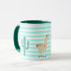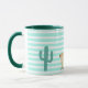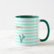 Cute lama, cactus and fiesta theme. Beige coloured llamas and green cacti on slim mint green and white coloured horizontal stripes. Brown letters and the Word: Lama