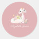 Adorable and sweet white llama with flowers on a pink round sticker with babies name.