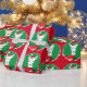 Novelty Christmas wrapping paper for a pattern of llamas in Santa outfits inside round, decorative, frames. The wrapping paper has a red and green background and is just plain fun.