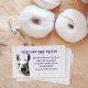 Llama business cards with knit stitches background. Customize purple text in two places with bolder, modern printing at the top for the business name. All other information is in paragraph form next to a fun, black and white llama face. Perfect for a specialty yarn shop, knitting teacher, fiber artist, or llama farmer.