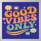 This design radiates positive energy with the phrase "Good Vibes Only" in a bold, retro font, accompanied by vibrant elements such as flowers, a radiant sun, and scattered stars. Its combination of warm and striking colors makes it a perfect piece for those looking to convey optimism and joy with their style. Ideal for those seeking a design about emotional well-being, motivation, self-expression, and alternative fashion, this design resonates with people who value a positive attitude and vintage aesthetic in their accessories and clothing. Its psychedelic, '70s-inspired feel makes it ideal for followers of bohemian fashion, modern hippies, and decor with a nostalgic touch. Available on products such as t-shirts, mugs, posters, and stickers, this design is an excellent choice for those looking to surround themselves with good energy and retro style. Its versatility makes it a unique gift for friends, family, and lovers of graphic art with a motivational message.
