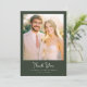 This elegant wedding thank you card features a warm, sunlit photo area that captures the essence of celebration and joy. The design is framed with a sophisticated dark green border, complementing the soft pastel tones within the image. The typography is stylish and modern, adding a touch of refinement to the overall look. Perfect for expressing gratitude after a special occasion, this card exudes a heartfelt and timeless charm, making it an ideal choice for newlyweds looking to thank their loved ones in style.
