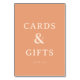 This elegant tabletop sign features a minimalist design with a soft peach background, creating a warm and inviting atmosphere. The text "CARDS & GIFTS" is prominently displayed in an understated serif font, complemented by the smaller phrase "thank you," adding a touch of gratitude to your special occasion. Perfect for weddings or bridal showers, this sign exudes sophistication and charm, enhancing any table setting while maintaining a clean and modern aesthetic. Its simple yet refined style ensures it will blend seamlessly into various decor themes, making it a versatile addition to your celebration.