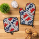 Oven mitt and potholder with lobster and crabs pattern. Red and blue colours on grey, will brighten any kitchen. Perfect gift for a seafood lover!