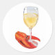 Sticker featuring an illustration of a lobster claw around the stem of a white wine glass. Artwork copyright: Dominic A. White. All rights reserved.