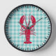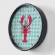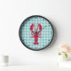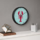 Fun seafood wall clock that goes with all sorts of coastal and summer decor themes! Design features red lobster silhouette on blue gingham background