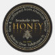 Black Label with the word HONEY written & reflected in metallic gold on black background with double gold and dotted border. Vintage bee outline illustration. Pre-calculated list of honey net weight conversions. Editable text in a curved border reads "Raw & Unfiltered from American Nectar."