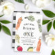 This cute "locally grown" gender-neutral farmer's market 1st/first birthday invitation features a white background with vegetables and fruits in watercolor. The reverse side features a white background with black buffalo/gingham check patterns. Personalise for your needs. You can find matching products at my store.