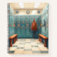 A retro vibe locker room with old school chequered floor and fluorescent lighting shows rows of closed blue lockers with a hanging red knapsack. What story does this cover tell or inspire to write about in this notebook, meant for poetry and song lyrics and funny memes and maybe even some class notes. An unique back to school spiral bound notebook.