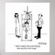 A man in handcuffs hangs upside down in a tank of water says, "I didn't realise the locksmithing test would be this tough."