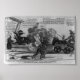The artist shows it to be a decisive weapon for the Democrats against Clay and his pro-Bank platform. The "masked battery" is a large cannon fired by Polk and the diminutive Democratic senator from Mississippi Robert J. Walker. Walker's February letter defending annexation had brought the Texas issue to the fore in the campaign. The cannon has been "masked" or hidden from the Whigs on the left by two rows of knights, among whom are Van Buren and Calhoun (carrying flags of their respective states, New York and South Carolina) and John Tyler and Richard M. Johnson. In a balloon above the scene appear Andrew Jackson's "General Orders" on the campaign strategy: "Let the enemy expend their fire on the veteran candidates in Armour [Van Buren, Calhoun, et al], drawn up before the Battery so as to hide it perfectly. Then, when the enemy is prepared to charge, open suddenly to the right and left in double quick time, and let go the big Gun charged with Texas." Polk, lighting the charge, says "Alas poor Harry! You should not have stood by that Bank and opposed our younger sister State who asks our help." At left, Henry Clay, Daniel Webster, and other Whigs are felled by the "Texas" cannonball. Clay is knocked into a column of the U.S. Bank, which breaks and topples the building. Clay: "Oh! who would have thought that behind those leaders they had a commander-in-chief & a masked battery, with my old enemy [i.e., Polk] I d--d to H--l, on the Pensylvania avenue. How did he come here? I'm a gone coon!" Clay refers to his celebrated outburst against then-Speaker of the House Polk in 1838. (On this, see "Scene in Washington," no. 1838-16). Clay's running-mate Theodore Frelinghuysen appears at the far left as a devil in clerical robes, weighed down by an immense "Bag of lies about the Loco Foco Candidates not yet paid for." He says, "The main pillar of the Bank broken! who is now to pay me for all the lies I had stored up in Washington against the Loco Foco candidates? It is too late to make up any about Polk & Dallas, & I shall never be paid unless I take my men on whom the Bank is falling."