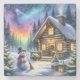 A watercolor style image capturing a tranquil Christmas night with a log cabin and a merry snowman outside.