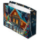 Christmas gift bag. A beautiful illuminated log cabin on Christmas Eve with Christmas lights and snow topped trees.