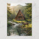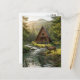 A postcard to say hi to friends and family with a wilderness nature theme. The illustration is an a-frame log cabin out in the mountains and woods with a deer next to a rippling stream.
