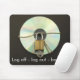Mouse mat with photo of CDROM secured with padlock and chain. On dark grey background. With words "Log off - log out - be safe!" A reminder of the importance of securing your workstation and protecting data.