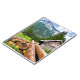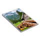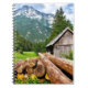 Featuring a no longer working logging camp, with aged logs laying in a pile, tucked down into a valley right beside a bright green forest.
