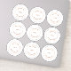 A handy sheet of nine round stickers, of approximately 2.5 inches each in diameter, to say Thank You on a giveaway or favour from your business to either staff or delegates. Each of the 9 stickers can be personalised with a different staff member's name or delegate name. You can also easily swap in your business logo and company website address both of which will update simultaneously on all nine.