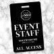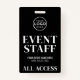 Your Logo Black White All Access Event Staff Badge. Great for fashion shows, concerts, large special events like conferences, concerts, lectures, and can even work for a birthday party or any other party where you want to make your guests feel special. A simple modern, yet elegant, look with a spot to add your company or even logo up top. At bottom is a bold serif font mixed with simple typography, with Event Staff, the event name, date, and 'All Access Pass'. You can change all of the text information and colours of this badge.