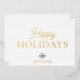 Send elegant holiday greetings to clients, employees, and business partners with this sophisticated simple minimalist corporate Happy Holidays card. Featuring genuine gold foil “Happy Holidays” text on a customisable clean basic white background, this design exudes both style and professionalism. Personalise with your custom logo and add your holiday message on both sides. The white background is easily changeable to suit your brand colours, and the gold foil can be switched to rose gold or silver for a unique touch. This card is set as a convenient online template, allowing seamless customisation to create the perfect seasonal message for your office and professional network.