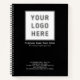 Simple black notebook for your company, business, or projects, featuring your logo and company information on the front. The back has a smaller version of the same logo at the bottom. (You only need to upload one logo image file.) Personalise with your business name, tag line or slogan, address, phone numbers, email addresses, web site and social media URLs. Clean, straightforward template, suitable for companies, businesses, and organisations big and small.