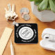 Double sided keychain with your custom logo on a white, round background surrounded by circular text on the front and QR code on the back on a black or custom colour background. Change fonts and colours, move and resize elements with the design tool.