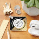 Double sided keychain with your custom logo on a white, round background surrounded by circular text on the front and QR code on the back. Black and golden gradient (printed image) background. Change fonts and font colours, move and resize elements with the design tool.