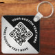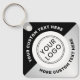 Double sided keychain with your custom logo on a white, round background surrounded by circular text on the front and QR code on the back. Black and light grey gradient background. Change fonts and font colours, move and resize elements with the design tool.