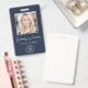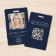 Professional blue ID badge featuring your employee's photo, their name in a chic white script and their title in simple white lettering, and your business or organisation's logo. On the back, add additional information and optional QR code.