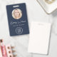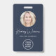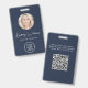 Professional blue ID badge featuring your employee's photo in a circle frame, their name in a chic white script, their title in clean white lettering, and your business or organisation's logo. On the back, add any additional information and an optional QR code. The QR code is automatically generated by Zazzle from the website address you provide.