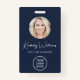 Professional blue ID badge featuring your employee's photo in a circle frame, their name in a chic white script, their title in clean white lettering, and your business or organisation's logo. On the back, add any additional information and an optional QR code.