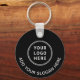 Modern promotional black keychain for your company or organisation. Upload your logo, easily create a scannable QR code linked to your website, and add two lines of white text, such as your business name, slogan, thank you, or leave blank.