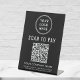 Modern black able top pedestal sign for your business featuring a QR code for customers to scan for payments, enabling you to receive payments anytime, anywhere. Upload your logo and add your business name, phone number and street address or other information in simple white typography. Input your payment website address to automatically create a scannable QR code.