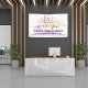 A banner for promotion of the reopening of your interior designer business after Covid-19, the corona virus. A white background with light airy pastel coloured painted brush strokes in pink, purple, yellow, faux gold. The text: We are open. Personalise and add your business logo, name, address and contact information.