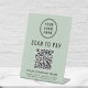 Modern sage green table top pedestal sign for your business with a QR code that customers can scan for payments, enabling you to receive payments anytime, anywhere. Upload your logo and add your business name, phone number and street address or other information in simple typography. Input your payment website address to automatically create a scannable QR code.