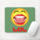 Smiling Face © Sunny Mars Designs. This cool, humourous, fun, mouse pad or mouse mat features a funny illustration of a yellow laughing face emoticon with an open big mouth, bright white pearly teeth, tongue and closed eyes, with the acronym "LOL" below which stands for Laughing Out Loud below it. Concept for humour.