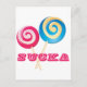 Two lollipops in blue and pink crossing each other. Text reads: Sucka.