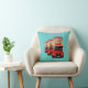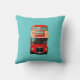 Cushion (throw pillow) in a jade colour illustrated with a montage of three London buses. On the reverse is a single image of the London bus from times gone by.