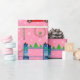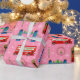 This unique Christmas London illustration showcases all the iconic London landmarks beautifully decorated for the holiday season, featuring festive lights, wreaths, and snow-covered rooftops. The pattern includes famous sights like Big Ben, the London Eye, Tower Bridge, and red double-decker buses, and the Royal Guard standing next to his gingerbread guard house all adorned with Christmas decorations. The backdrop features a pink background with falling snowflakes, holly, and traditional holiday elements to capture the magic of Christmas in London.