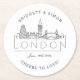 Personalised paper coasters for your next Wedding event in the city of London. It features a deco-style illustration of the city skyline. Surrounding this are spots for your unique information.