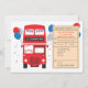 A fun kids party invite with a big red London bus, balloons and bunting that can be personalized with a child's name and age. Easily customize this birthday party invitation with your child's party details at no extra cost.